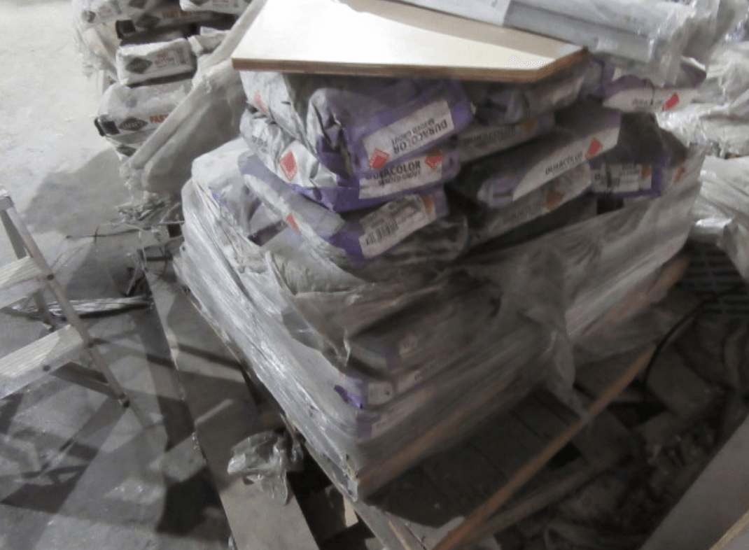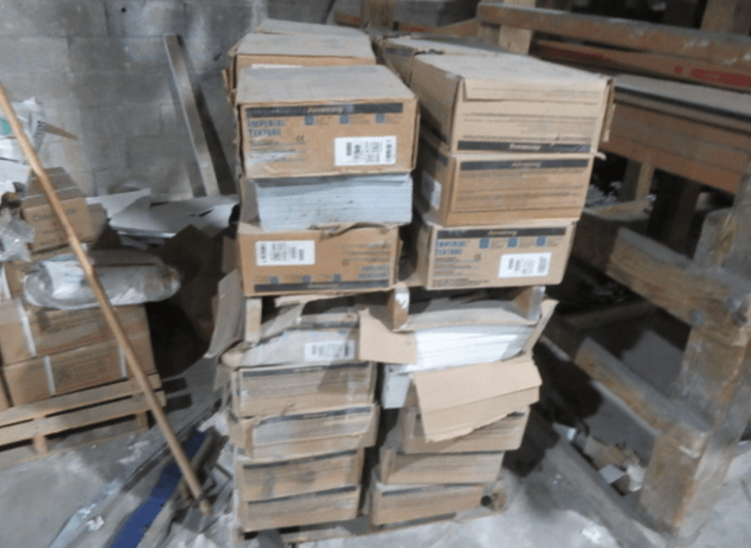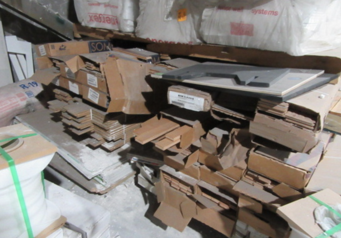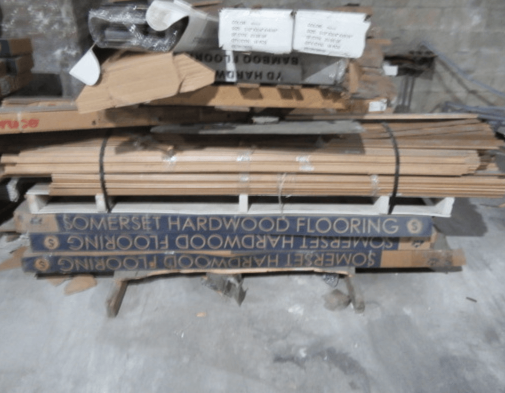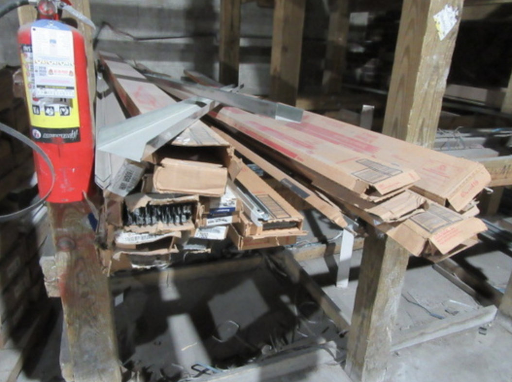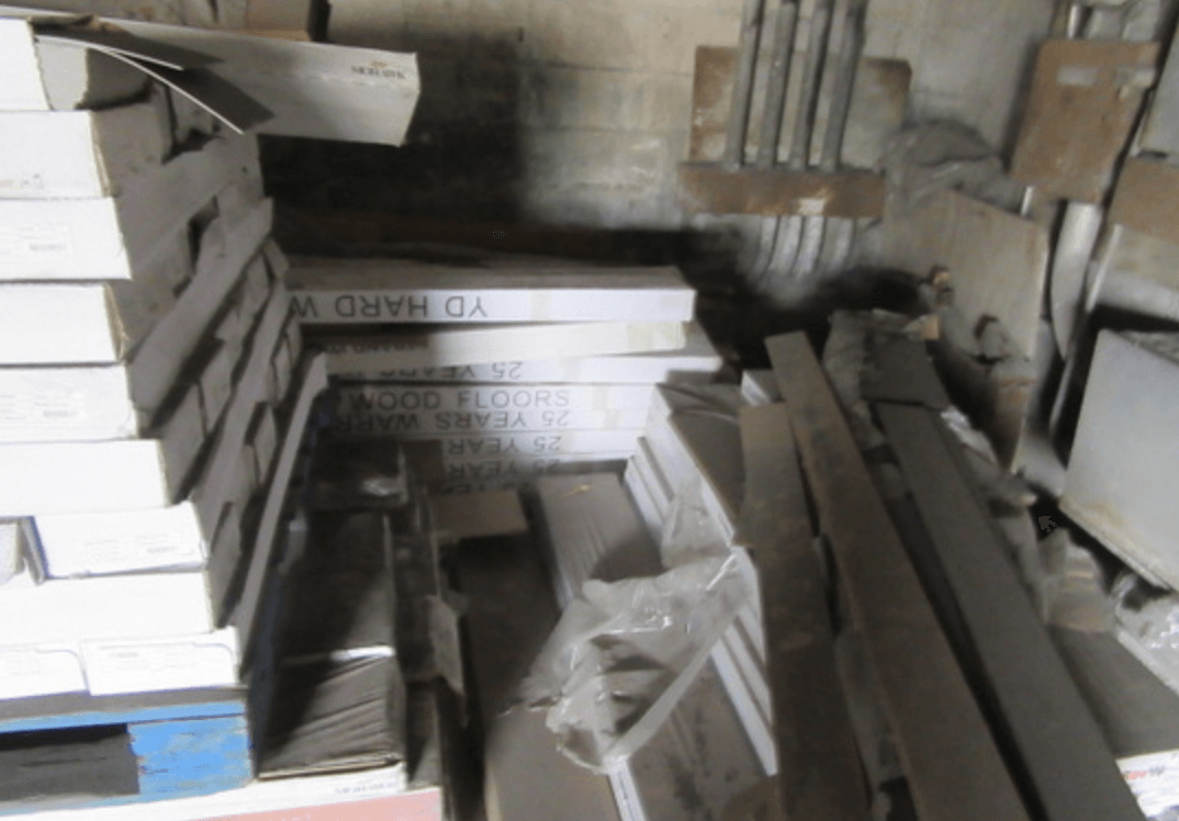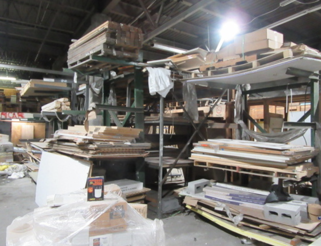 FEATURING LARGE QUANTITY CASES HARDWOOD FLOORING, LUMBER, MOULDING, METAL STUDS, SHEETS SLATWALL, PANELLING, SHEETROCK, BAGS CEMENT, MORTAR, GROUT, ROLLS PLASTIC WRAP, VINYL FLOOR TILE, GRID CEILING FRAMES & PANELS, STEEL FIRE DOORS & FRAMES, LARGE QUANTITY INTERIOR & EXTERIOR DOORS, STEEL & BLACK PIPE, INSULATION, GLASS BLOCKS, GALS. & 5 GAL. PAINT, INSULATION, 4 LARGE CRYSTAL CHANDELIERS, MORE...